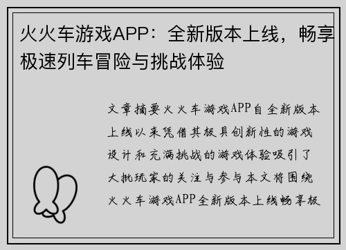 盛大游戏是中国游戏行业的标志性企业之一,凭借创新的精神和雄厚的实力,它在过去十年中经历了辉煌的传奇与深刻的变革。从《传奇》到《热血传奇》,从技术革新到行业领导地位,盛大游戏的成长路径深刻影响了中国乃至全球游戏市场的发展。本文将从四个方面对盛大游戏的全景回顾与未来发展展望进行详细阐述:第一,盛大游戏的...